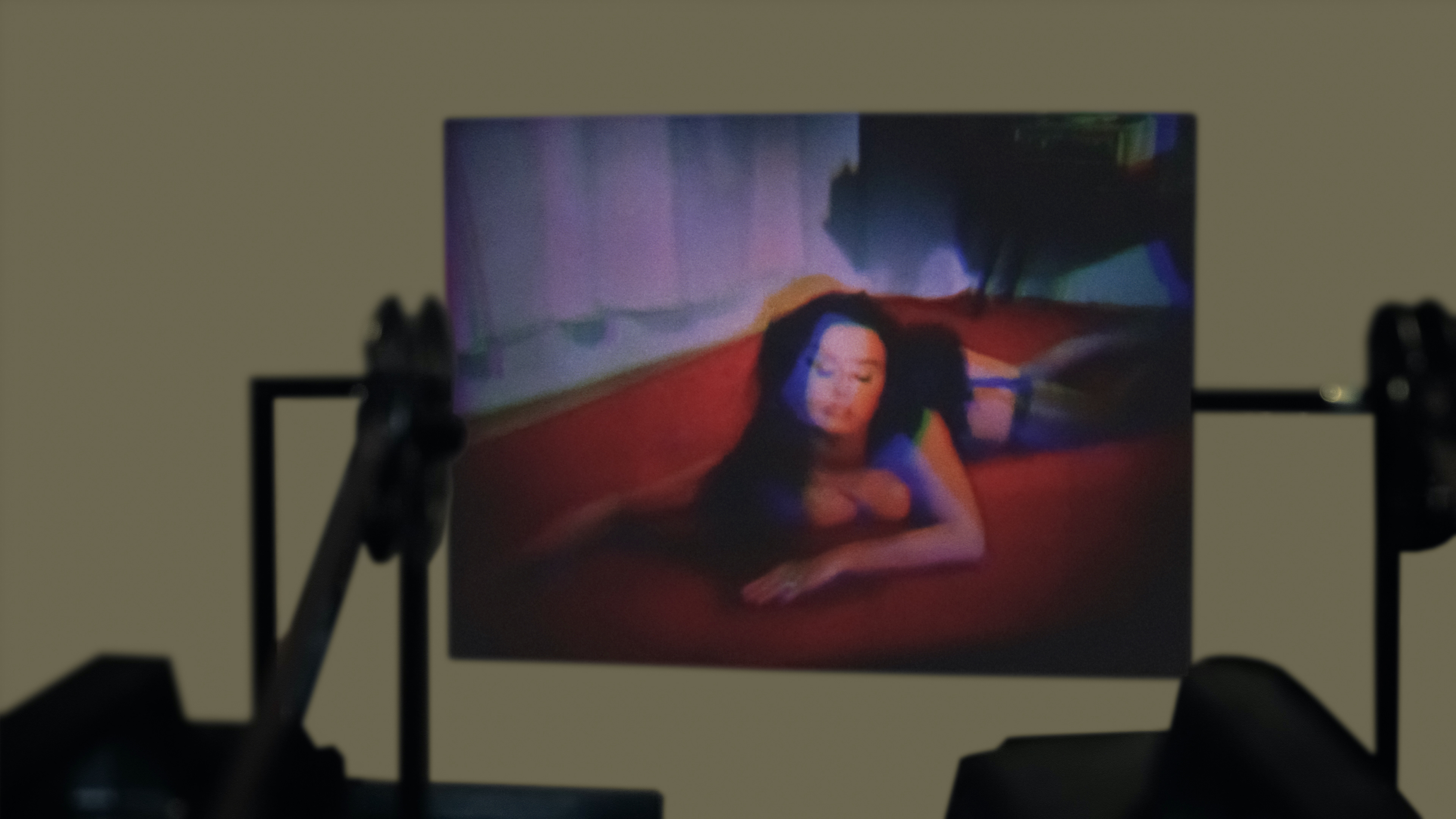 The term "Cura Morum" has its etymological origin in the Roman Republic. It was used to refer to the supervision by censors of public morality and surveillance of customs. The projected image refers to the figure of actress Isabel Sarli in a scene from the 1969 film "Desnuda en la arena" (Naked in the Sand), directed by Armando Bó. The projection technique used partly recreates the Technicolor and Eastmancolor formats that dominated commercial film productions of that era. The sound coming from the projectors' own speakers relates to a journalistic document from the late 1960s, in which Isabel Sarli visits the Film Rating Board of Buenos Aires City to meet with the then-responsible person and demand an end to the censorship exercised over the exhibition and cuts of several of her films in which she appears nude.